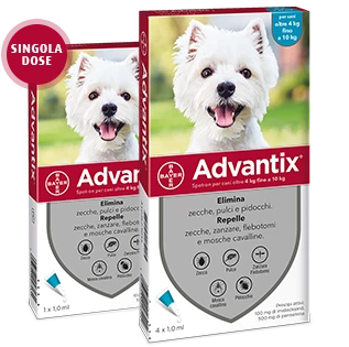 Advantix Spot On per cani 4-10 Kg agisce contro pulci e zecche ed è un repellente nei confronti di zanzare e flebotomi nei cani.