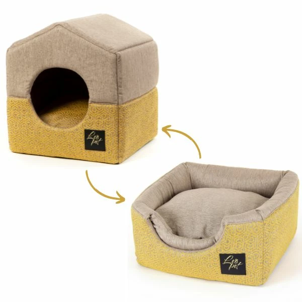 La Cuccia richiudibile Gold Cottage Premium Leopet è realizzata per metà in tessuto Teflon fantasia esagonale e metà in tessuto Teflon strutturato tinta unita. Con un unico movimento, si trasformerà da classica cuccia aperta, a simpatica casetta con oblò frontale. Come se acquistassi due cucce al prezzo di una!
