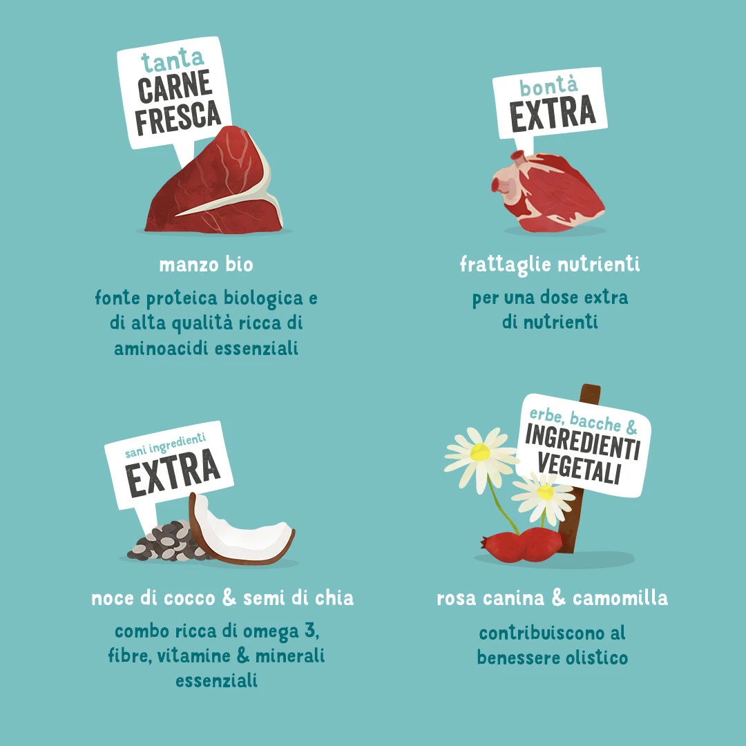 Composizione: *Prodotto proveniente da agricoltura biologica controllata al 100%. Manzo* biologico 51%, maiale* biologico, pollo* biologico, minerali, cocco* biologico 0,15%, semi di chia* biologica 0,15%, cinorrodi* biologici 0,1%, camomilla* biologica 0,1%.