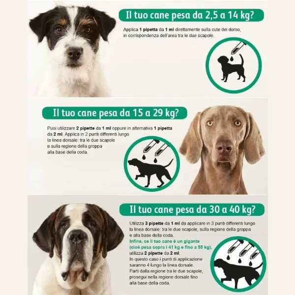 - Cani di peso compreso tra i 30 e i 40 kg: 3 pipette da 1 ml, pari a una dose massima di permetrina di 71,5 mg/kg (cani di 30 kg) e minima di 53,6 mg/kg (cani di 40 kg). Premere le pipette con fermezza, fino a svuotarne l’intero contenuto direttamente sulla cute del dorso. Applicare il contenuto delle singole pipette in tre punti differenti lungo la linea dorsale, partendo dalla regione delimitata dalle due scapole fino alla regione della groppa, in corrispondenza della base della coda, avendo cura che il prodotto non coli sul pelo.