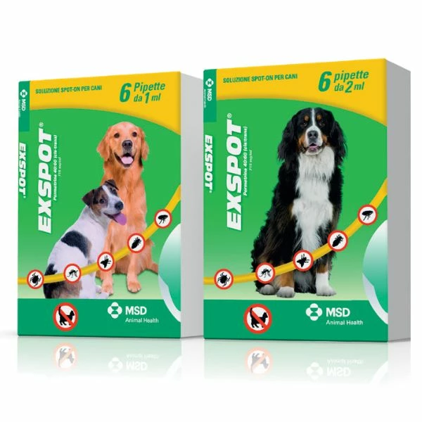 Scegli l’antiparassitario Exspot più adatto al tuo cane. Due le confezioni: quella con 6 pipette da 1 ml per i cani di piccola taglia e quella con 6 pipette da 2 ml per i cani più grossi. Somministrare la/le pipette ogni 4 settimane.