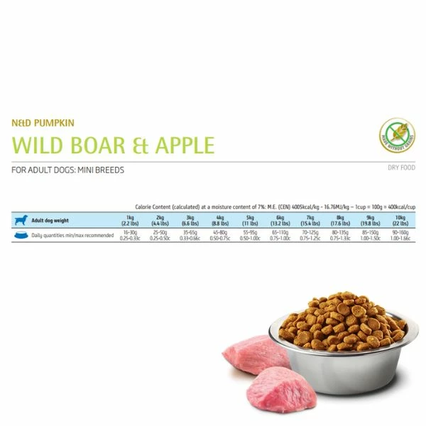 Farmina N&D Grain Free Pumpkin Adult Mini Cinghiale Mela è l’alimento secco completo, per cani adulti. Crocchette appositamente formulate per cani di taglia piccola, a base di cinghiale, zucca e mela. Alimento senza l’inclusione di grano.