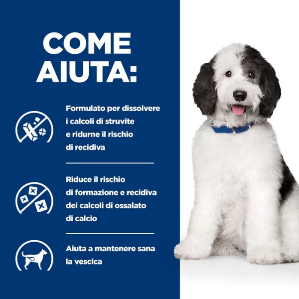 Informazioni aggiuntive: I calcoli alla vescica sono accumuli di cristalli minerali che si combinano nel tratto urinario. Possono causare disagio e portare problemi più seri che richiedono le cure di un veterinario. I nutrizionisti e veterinari di Hill’s hanno sviluppato Prescription Diet c/d Multicare nutrizione clinica appositamente formulata per supportare la salute urinaria del cane e ridurre il rischio di calcoli di struvite e ossalato di calcio. Questo alimento secco è fatto con pollo e ha un gusto irresistibile che il tuo cane adorerà.