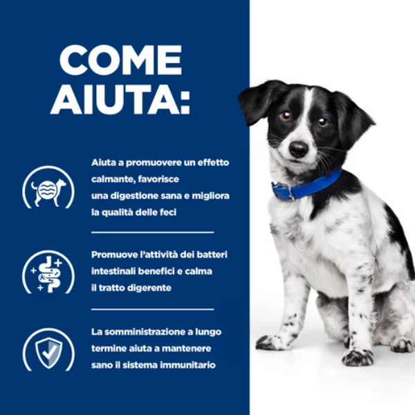 - arricchito con la tecnologia degli ingredienti ActivBiome+ di Hill’s,una speciale miscela di fibre prebiotiche, clinicamente dimostrata per nutrire rapidamente il microbioma intestinale, per supportare la qualità ottimale delle feci e la salute dell’apparato digerente.