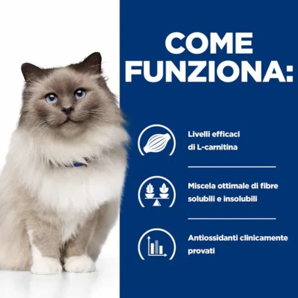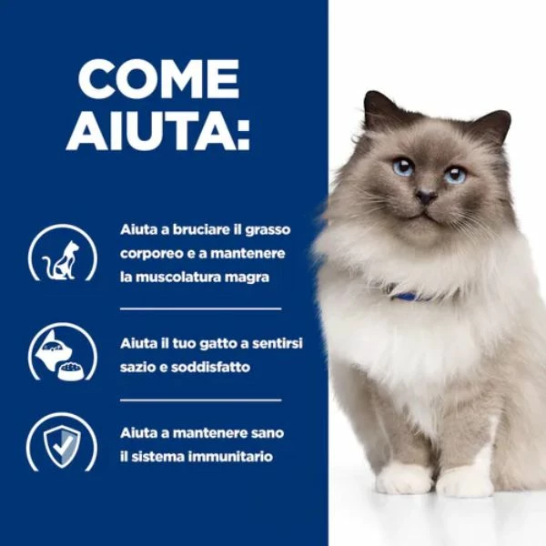 I nutrizionisti e i veterinari di Hill’s hanno sviluppato la nutrizione clinica Prescription Diet r/d appositamente formulata per supportare la perdita di peso dei gatti. Infatti, r/d è un alimento clinicamente testato per una sana perdita di peso in sole 4 settimane. Questo alimento secco è fatto con pollo e ha un gusto irresistibile che il tuo gatto adorerà.