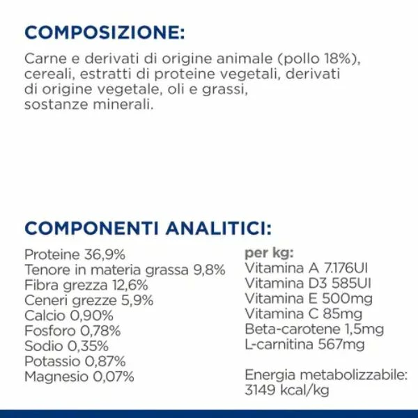 COMPONENTI ANALITICI: Proteine 36,9%, Tenore in materia grassa 9,8%, Fibra grezza 12,6%, Ceneri grezze 5,9%, Calcio 0,90%, Fosforo 0,78%, Sodio 0,35%, Potassio 0,87%, Magnesio 0,07%; per kg: Vitamina A 7.176 UI, Vitamina D3 585 UI, Vitamina E 500 mg, Vitamina C 85 mg, Beta-carotene 1,5 mg, L-carnitina 567 mg.