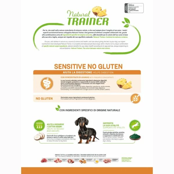 Trainer Natural Dog Sensitive No Gluten Adult Small e Toy con Coniglio è un alimento completo ed equilibrato per cani adulti di taglia toy/taglia piccola, 1-10 Kg di peso vivo. Dalla formula monoproteica animale, aiuta la digestione del tuo cane, grazie al concentrato di Ananas incluso nella ricetta.