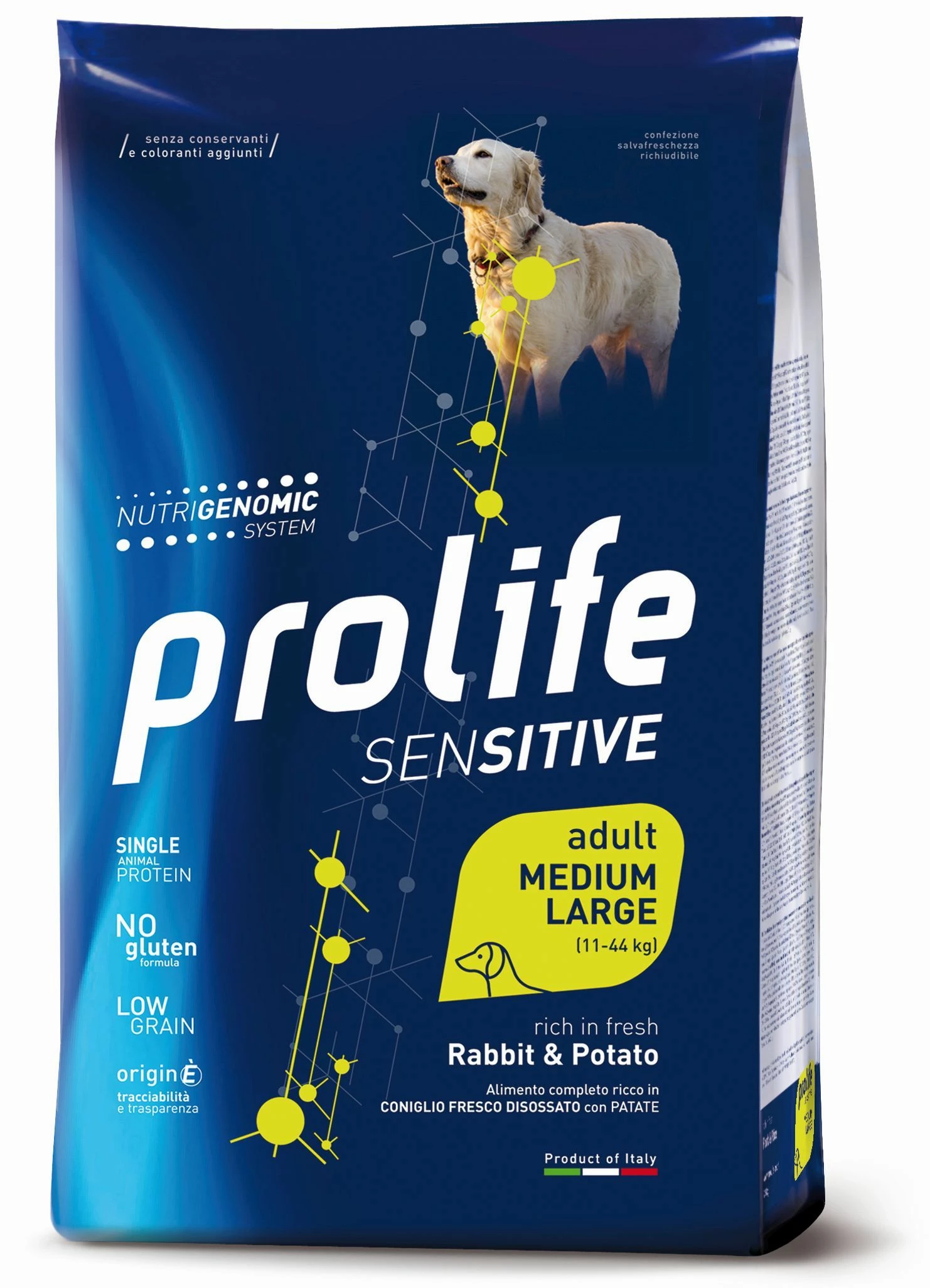 Prolife Sensitive Cane Adult Medium/Large Coniglio e Patate è un alimento completo ricco di carne fresca di coniglio, patate e riso per il cane adulto ipersensibile formulato per le esigenze nutrizionali del cane adulto che presenta sensibilità digestive, articolari o cutanee. Le cause di un’ipersensibilità possono essere molteplici: regime alimentare instabile, variazioni improvvise nel ritmo di vita, sforzi prolungati e intensi, inquinamento atmosferico, scarsa qualità dell’alimentazione… L’utilizzo di una carne non familiare quale il Coniglio, della Patata e del Riso, fonti di carboidrati, rende l’alimento appetibile e digeribile, ideale per questa tipologia di cani.