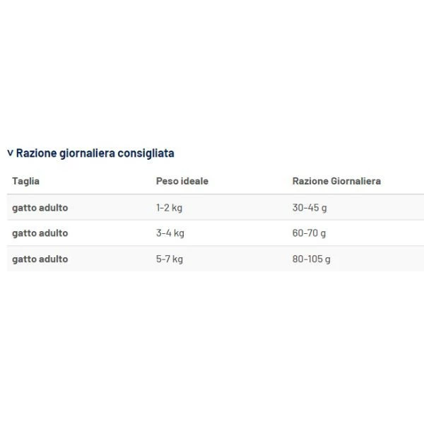 | gatto adulto | 1 – 2 kg | 30 – 45 gr |