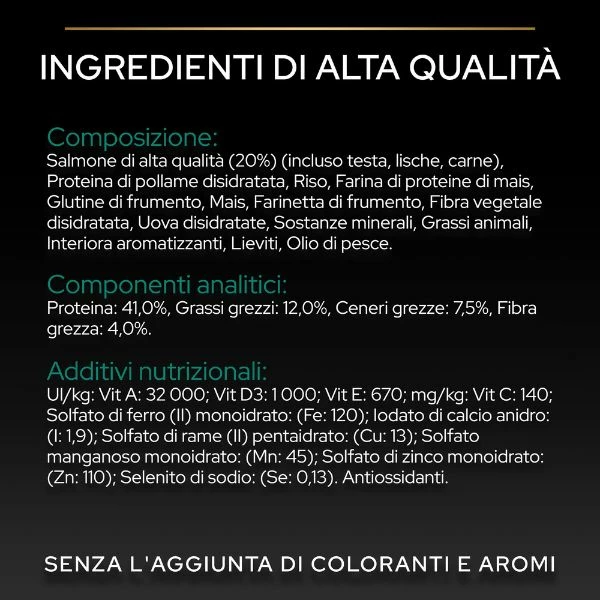 COMPOSIZIONE: Salmone di alta qualità (20,0%) (incluso testa, lische, carne), Proteina di pollame disidratata, Riso, Farina di proteine di mais, Glutine di frumento, Mais, Farinetta di frumento, Fibra vegetale disidratata, Uova disidratate, Sostanze minerali, Grassi animali, Interiora aromatizzanti, Lieviti, Olio di pesce.
