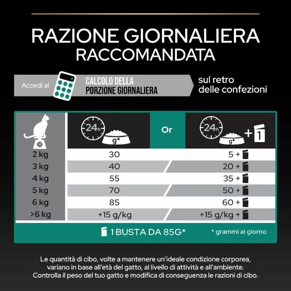 Peso del gatto: Quantità Crocchette: Quantità Crocchette + 1 busta umido 85g