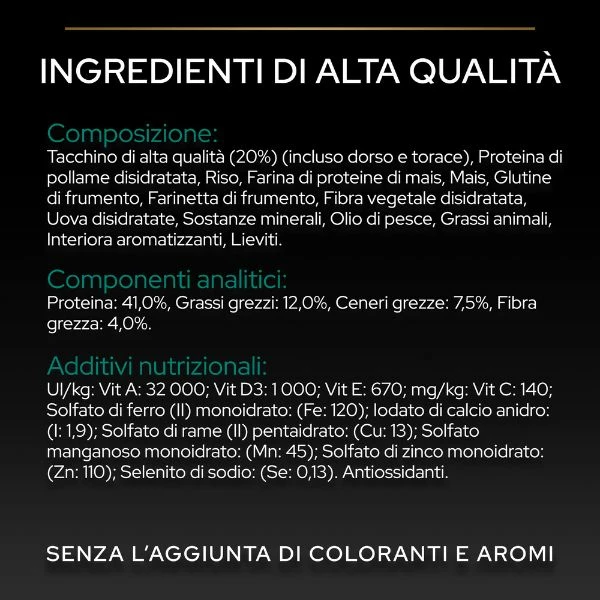 COMPOSIZIONE:Tacchino di alta qualità (20,0%) (incluso dorso e torace), Proteina di pollame disidratata, Riso, Farina di proteine di mais, Mais, Glutine di frumento, Farinetta di frumento, Fibra vegetale disidratata, Uova disidratate, Sostanze minerali, Olio di pesce, Grassi animali, Interiora aromatizzanti, Lieviti.