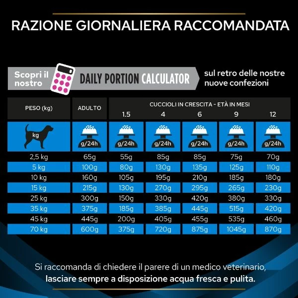 Razione giornaliera consigliata: vedi tabella illustrativa in gallery. Per cani oltre i 70 kg di peso: somministrare ulteriori 30g di alimento, per ogni 5 kg di peso in più.