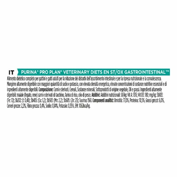 Purina Veterinary Diets EN è un alimento dietetico completo per gattini e gatti adulti per la riduzione dei disturbi dell’assorbimento intestinale e per la ripresa nutrizionale e la convalescenza. Mangime altamente digeribile con maggiori quantità di sodio e potassio, con elevata densità energetica, elevate concentrazioni di sostanze nutritive essenziali e di ingredienti altamente digeribili.