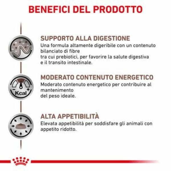 Raccomandazioni: Si raccomanda di chiedere il parere di un veterinario prima dell’uso. Utilizzare Gastrointestinal moderate calorie secco da 1 a 2 settimane durante le diarree acute e i periodi di convalescenza successivi. In caso di disturbi digestivi, utilizzare da 3 a 12 settimane e per tutta la vita in caso d’insufficienza pancreatica cronica.
